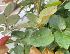以下の写真はクリックで拡大しますが、雨上がりでもないのにバラの葉っぱに水滴が綺麗に付着してました。