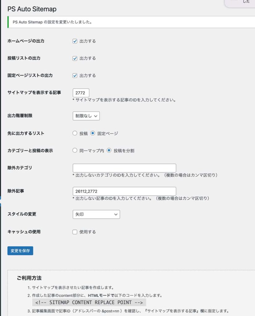 こちらがPS Auto Sitemapの設定画面ですが、一番下のキャッシュの使用をオフにしてあったのですが、こちら使用するに変更したら解決しました。