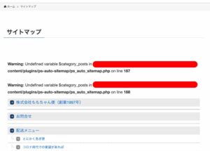 サイトマップの画面を開いたら以下のスクショの通りで、サイトマップの前にエラー表示が4行ほど出てしまっていた。