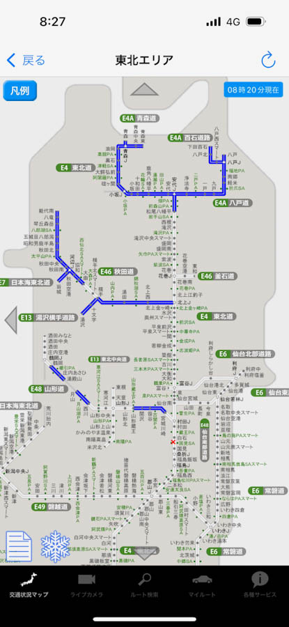 カーナビの画面でも、ネットの情報でも雪道の規制あり。
