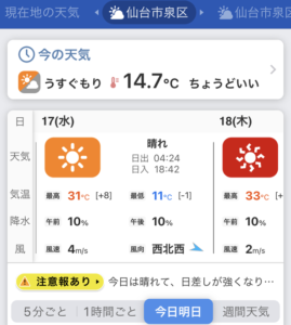 今日明日はこんな予報ですが、今日も朝まで暖房必須だったのに、今日の日中から明日にかけては夏みたいに暑くなりますね。いきなり冷房必要かも?
