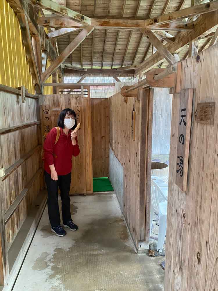 検温など終わって貸切露天風呂の鍵をお借りしてやって来た風呂場です。入り口がいくつかあって露天風呂もいくつかあったようですが、コロナ禍という事もあり平日でもあって私たちだけの利用で静かでした。