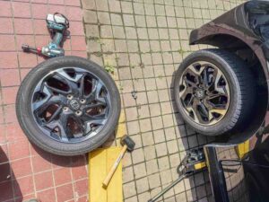 スタッドレスタイヤから夏タイヤに履き替えの様子です。
