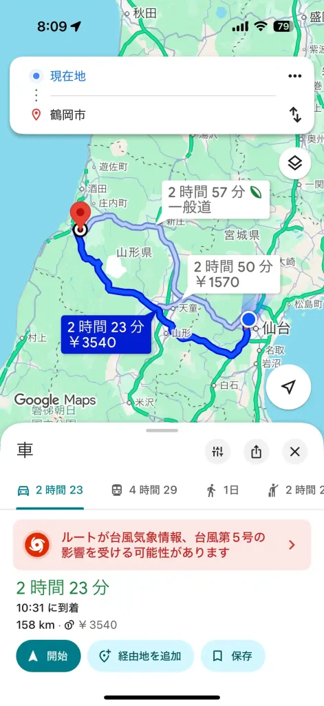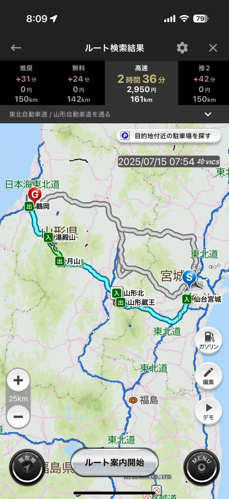 昨日の場合は、通行止めが発生してからある程度の時間が経過していた(1時間くらい?)ので、全社のカーナビアプリともに通行止めを反映したルートとして仙台から鶴岡市に引くものと思ってましたが、興味本位でテストしました。