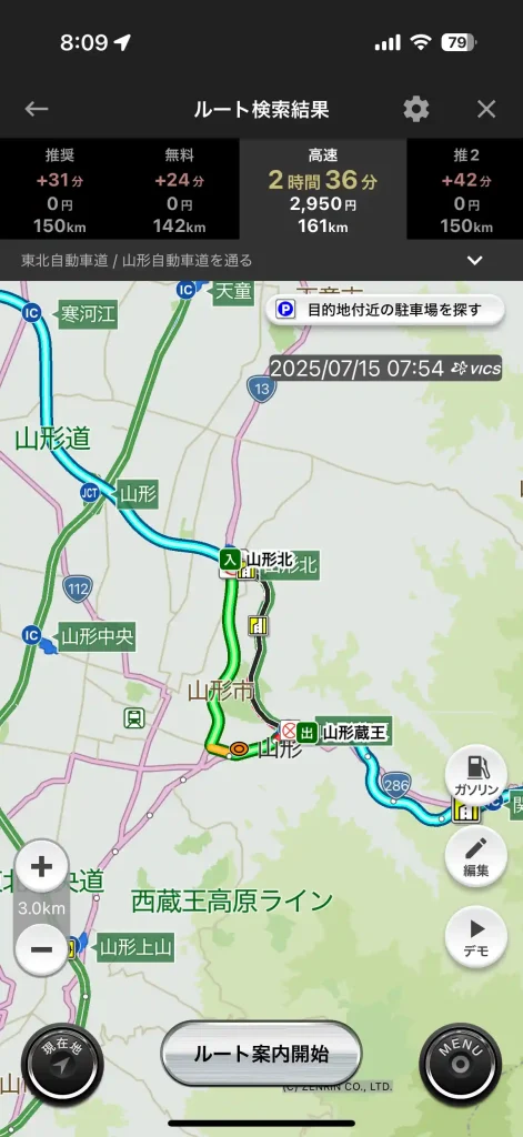 おお、良い感じに、山形蔵王から山形北インターの通行止め区間だけ下ろすルートになりました。