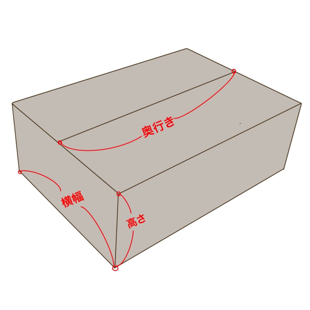 手に持てない荷物の場合は、少しお手数をおかけしますが、この絵の3辺をそれぞれ測って教えていただけると嬉しいです。