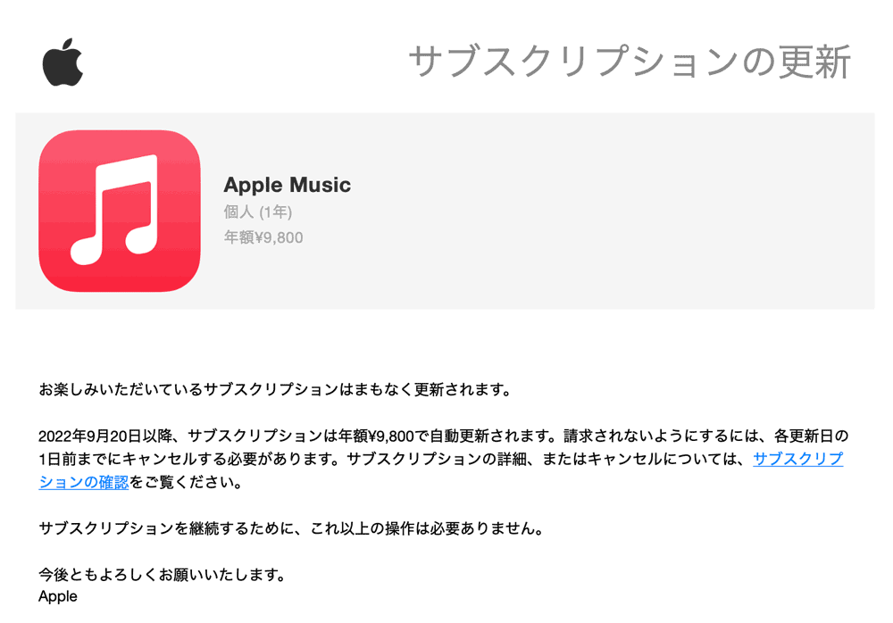 Apple Musicの契約更新の案内が来た